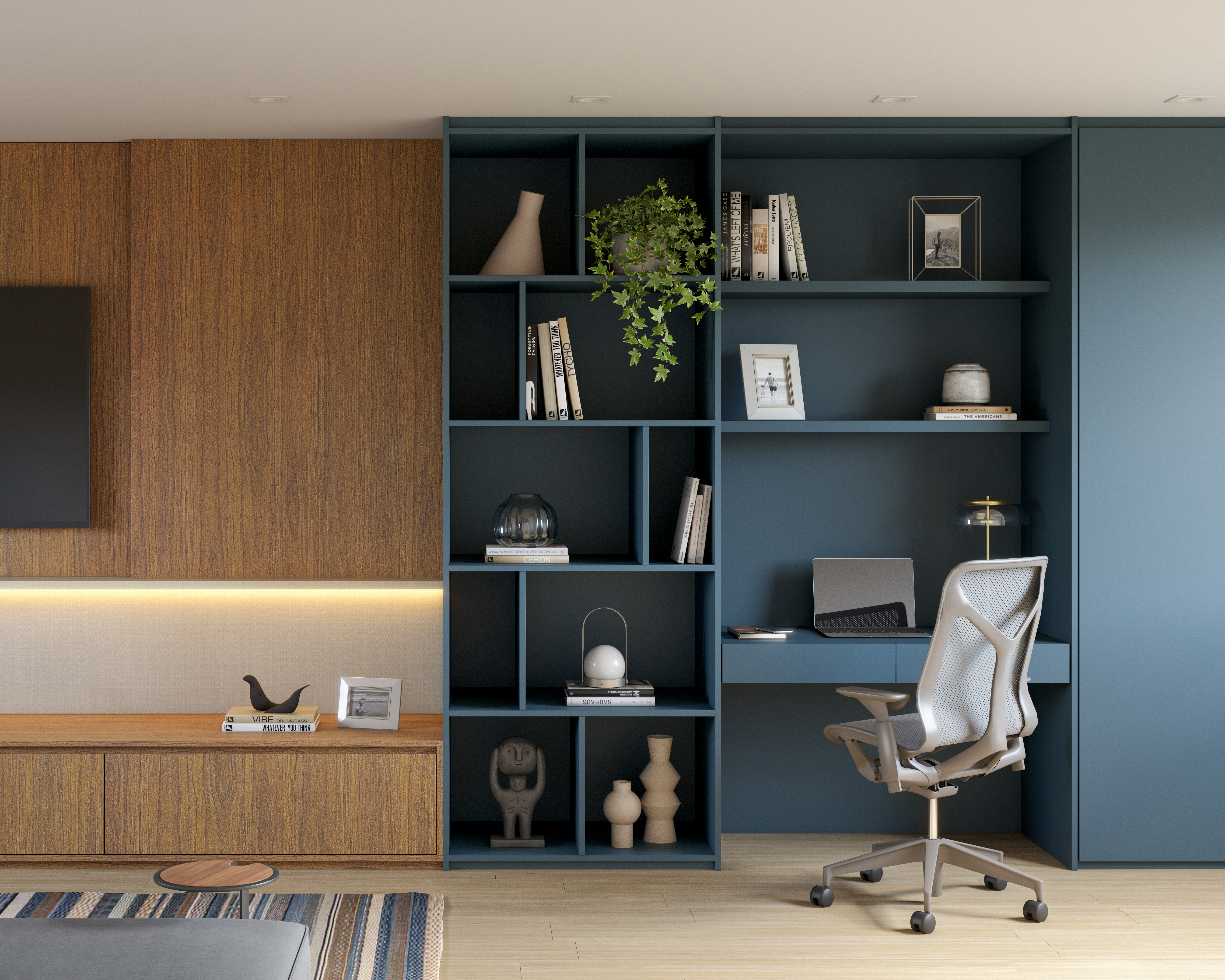 Detalhes decorativos, como luminárias, tapetes ou estantes.